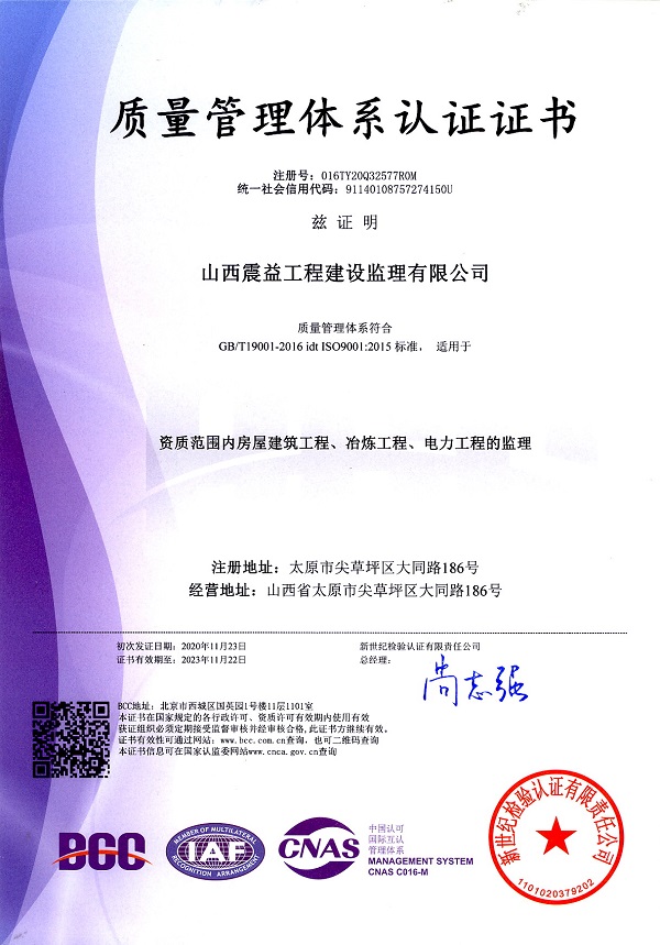 山西震益工程建設監理有限公司【原太原鋼鐵(集團)工程建設監理有限公司】成立于 1998年4月,注冊資金 600 萬元,是******批準的具有甲級執業資質的綜合性工程咨詢服務企業,具有冶煉工程、電力工程、礦山工程、房屋建筑工程、市政公用工程等5個工程監理甲級資質和設備監理甲級資質。主要業務涉及冶金、房屋建筑、礦山、電力、市政、機械、環保等領域的工程建設監理、設備監理、工程咨詢、造價咨詢、檢測試驗等。公司建立了質量ISO9001:2015標準、環境ISO14001:2015標準、職業健康******GB/T28001-2011 idt OHSAS 1800:2007標準 “三標一體”管理體系,是中國設備監理協會常務理事、中國冶金建設監理協會常務理事和山西省監理協會副會長單位。